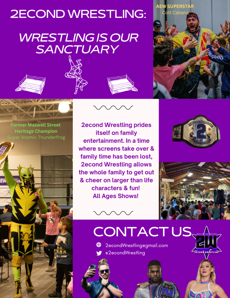 2econd Wrestling is a family friendly Chicagoland area LIVE Pro Wrestling company. We pride ourselves on working with the best talent in the world and highlighting Chicago area’s top up and coming talent. We work a variety of different venues from Bars, Community Centers, Churches/Synagogues, Summer Camps, Backyard Parties, and even a Glow in the Dark Boxing Gym!